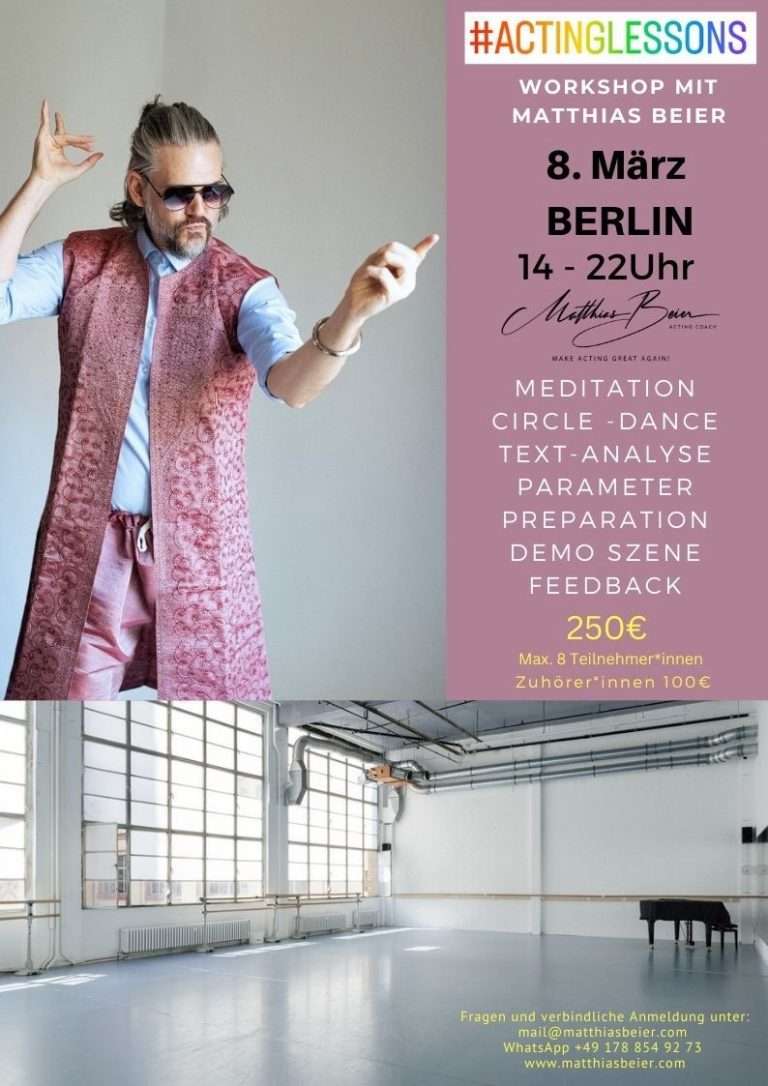 Ich veranstalte monatlich am ersten Samstag des Monats von 14 – 20 Uhr einen Workshop, damit Du trainieren kannst, Struktur ins Schauspiel bekommst, selbstständiger und differenzierter arbeiten kannst, Dich mit Kolleg*innen austauschen und mich und meine Arbeit persönlich kennenlernen kannst. Das ist ein ein preisgünstiger Deal, denn 6h Workshop kosten nur soviel wie eine Einzelstunde bei mir. Aktiven Teilnehmer*innen verrate ich ihre Archetypen und ihre komplette Seelenmatrix, was online unter GET YOUR ARCHETYPE NOW! 349€ kostet. Zuhörer*innen zahlen nur 100€.