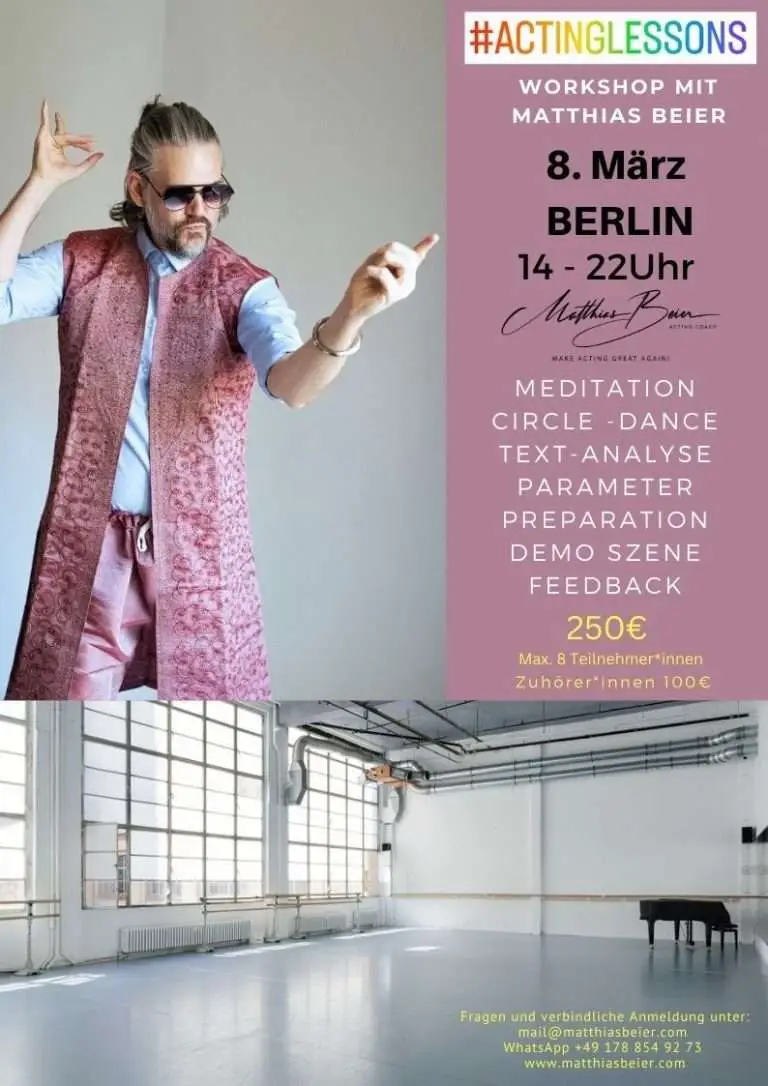 I organize a monthly workshop on the first Saturday of the month from 2 – 8 pm so that you can train, get structure in your acting, work more independently and differentiated, exchange ideas with colleagues and get to know me and my work personally. This is an affordable deal, because a 6-hour workshop only costs as much as a one-to-one session with me. For active participants I reveal their archetypes and their complete soul matrix, which costs 349€ online at GET YOUR ARCHETYPE NOW! Listeners only pay 100€.